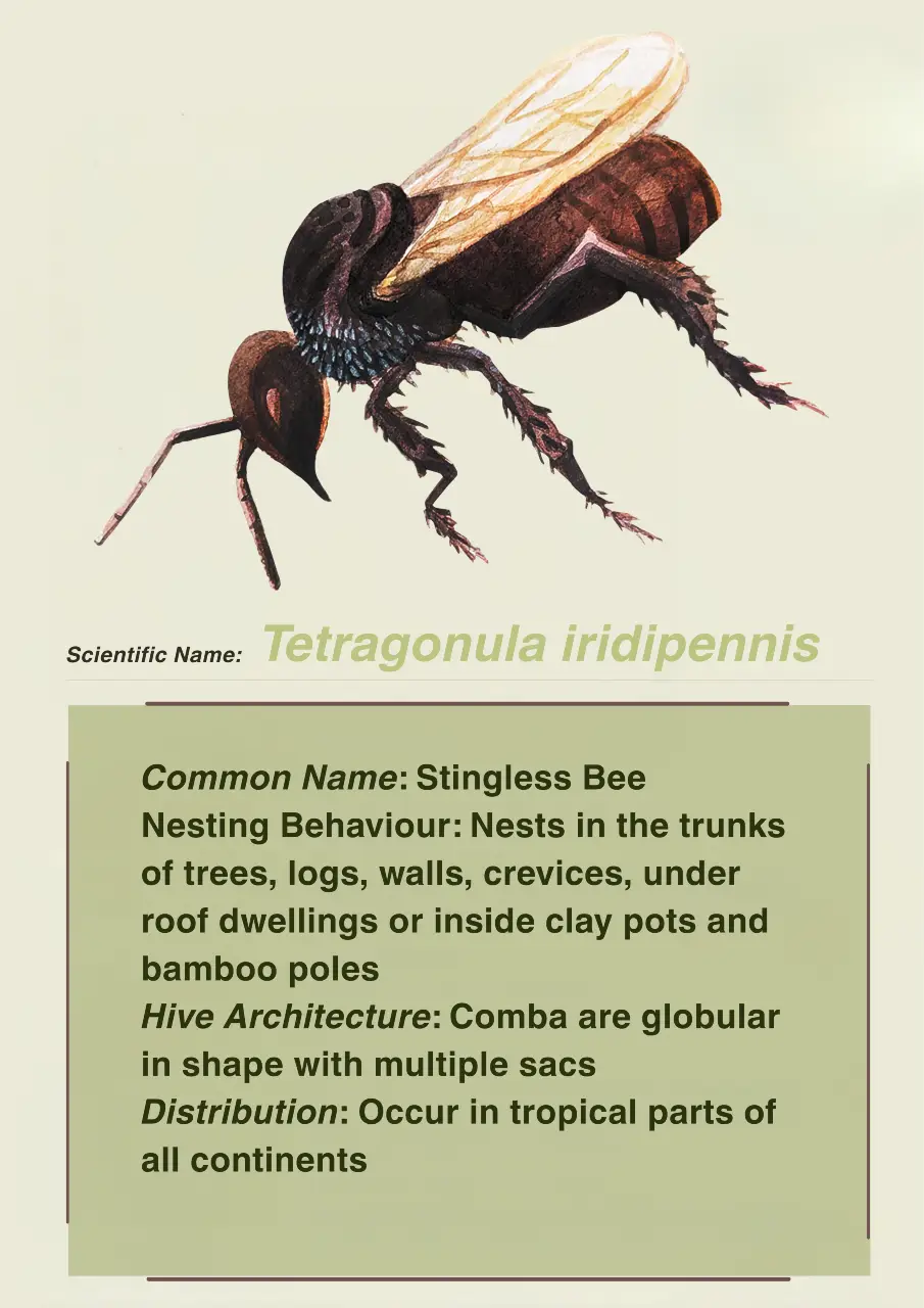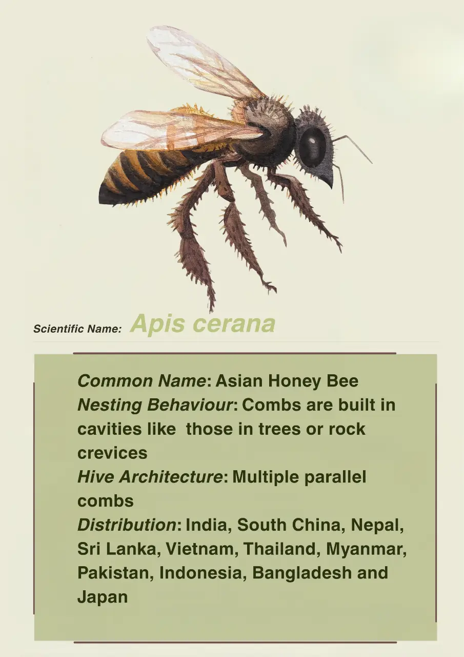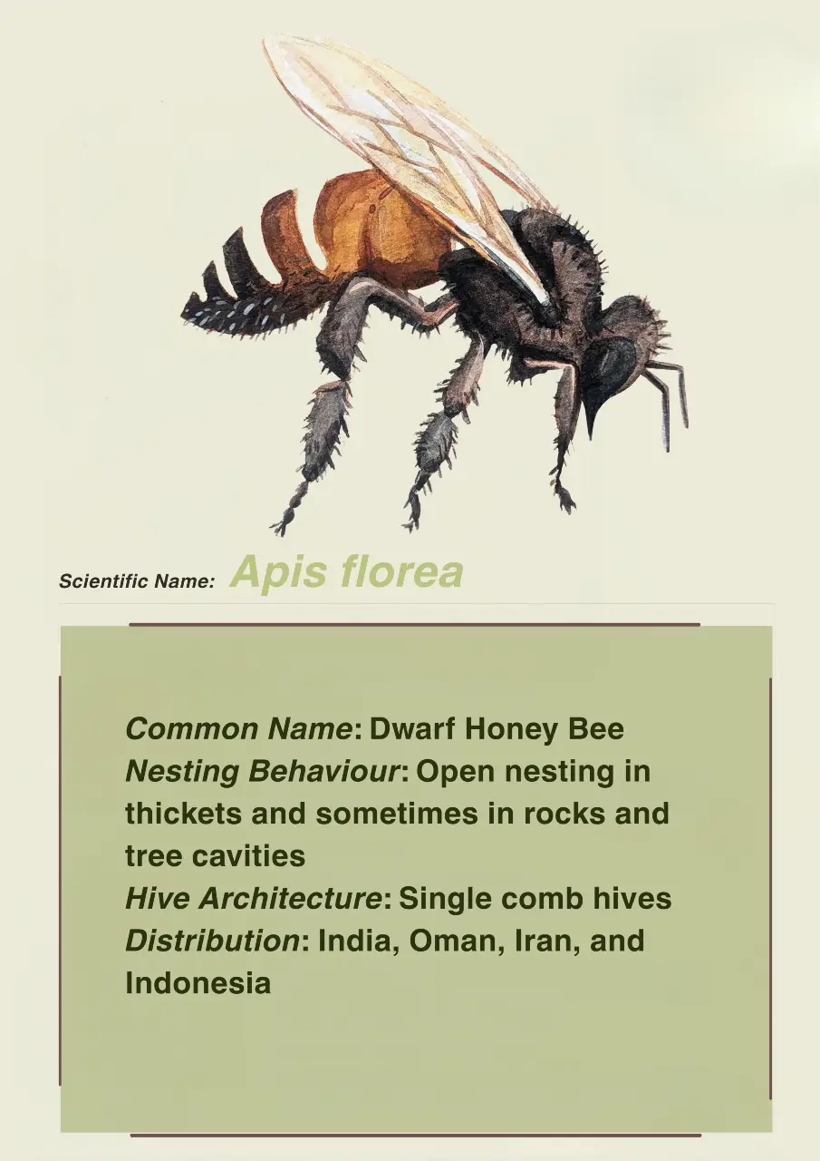 There are many different species of honey bees observed within the NBR. Apis dorsata is the largest social bee present in the NBR. They require vertical structures like cliffs and tall trees to construct their hives. They are migratory and follow the availability of floral resources. Apis cerana are medium sized bees that do not generally migrate. They generally build their hives in enclosed cavities like hollow trees. Apis florea prefer to nest in areas of dense vegetation. This species builds single comb nests and tends to migrate locally. Tetragonula iridipennis, or stingless bees are a small resident species which nest among boulders, old walls, dead trees and tree cavities. Apis karinjodian is also a newly discovered species that is found within the NBR.