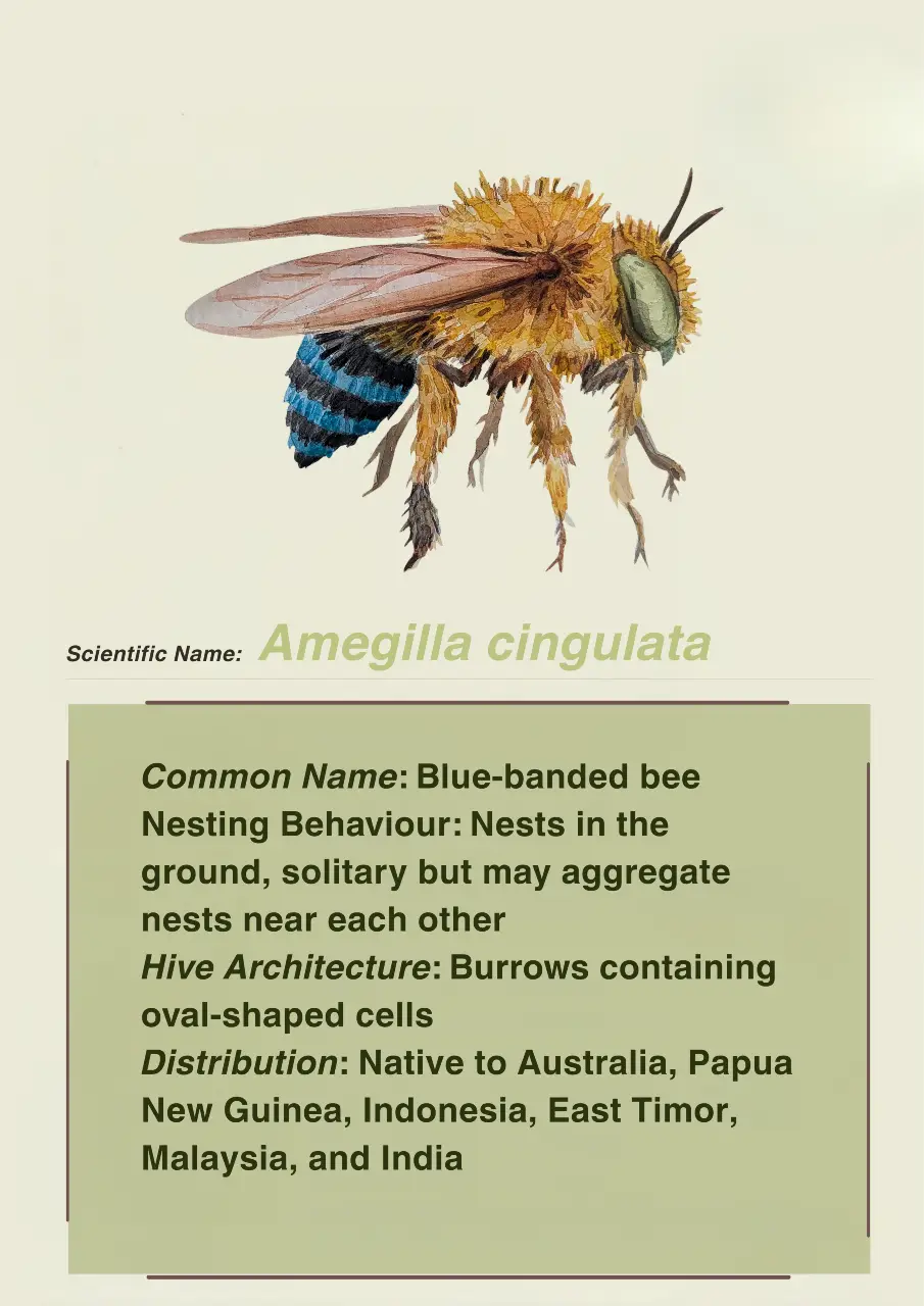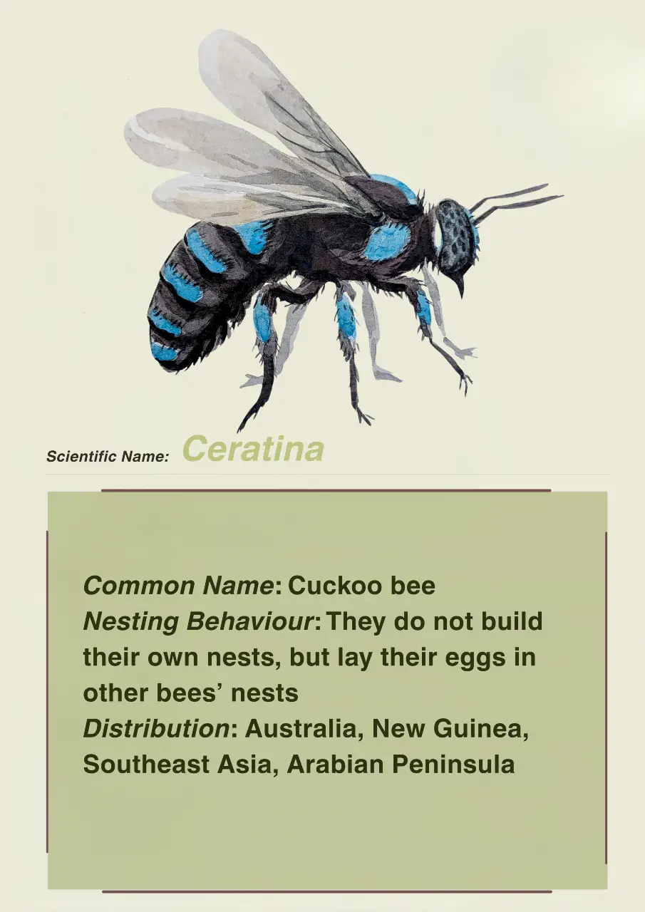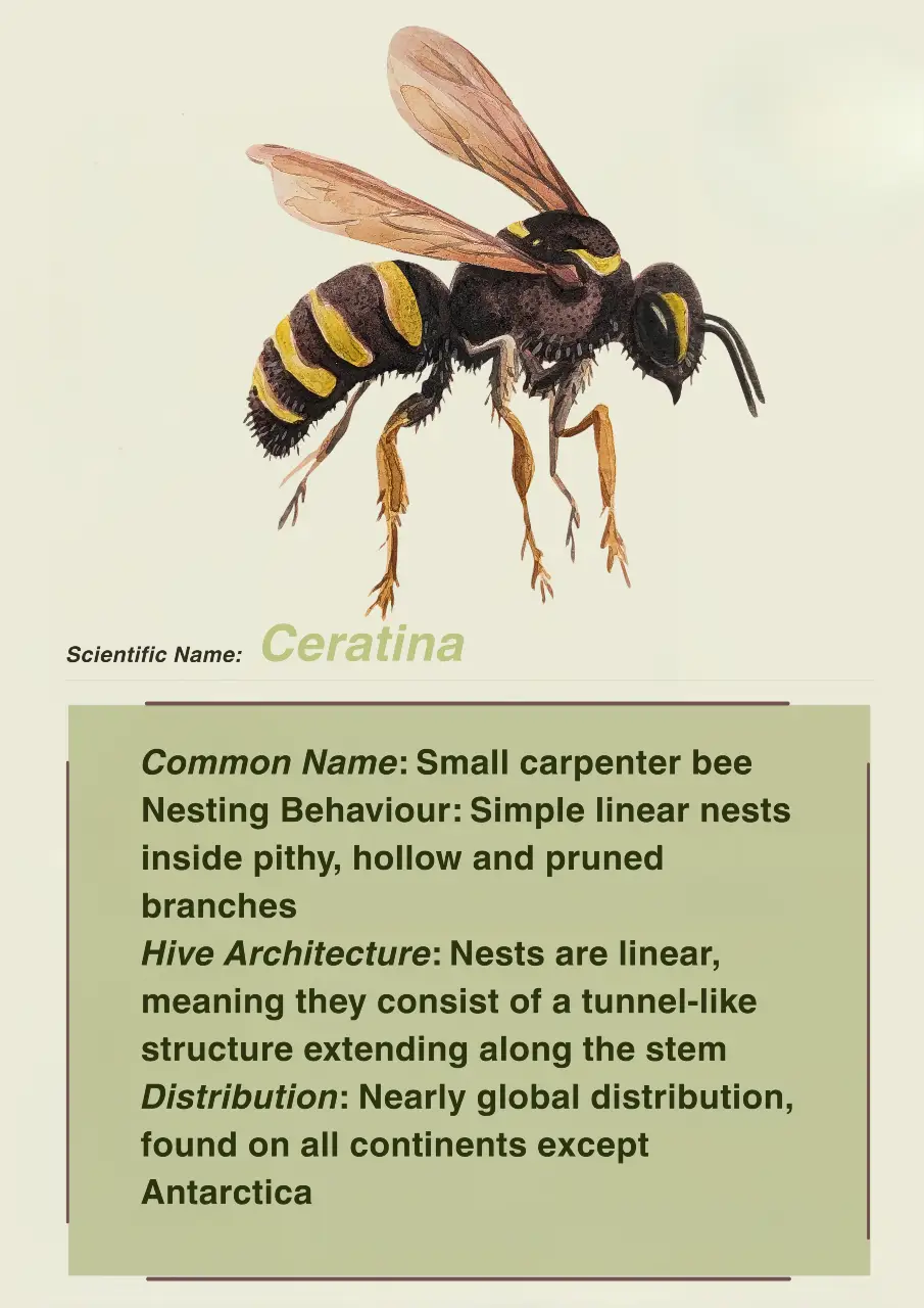 There are many different species of honey bees observed within the NBR. Apis dorsata is the largest social bee present in the NBR. They require vertical structures like cliffs and tall trees to construct their hives. They are migratory and follow the availability of floral resources. Apis cerana are medium sized bees that do not generally migrate. They generally build their hives in enclosed cavities like hollow trees. Apis florea prefer to nest in areas of dense vegetation. This species builds single comb nests and tends to migrate locally. Tetragonula iridipennis, or stingless bees are a small resident species which nest among boulders, old walls, dead trees and tree cavities. Apis karinjodian is also a newly discovered species that is found within the NBR.
